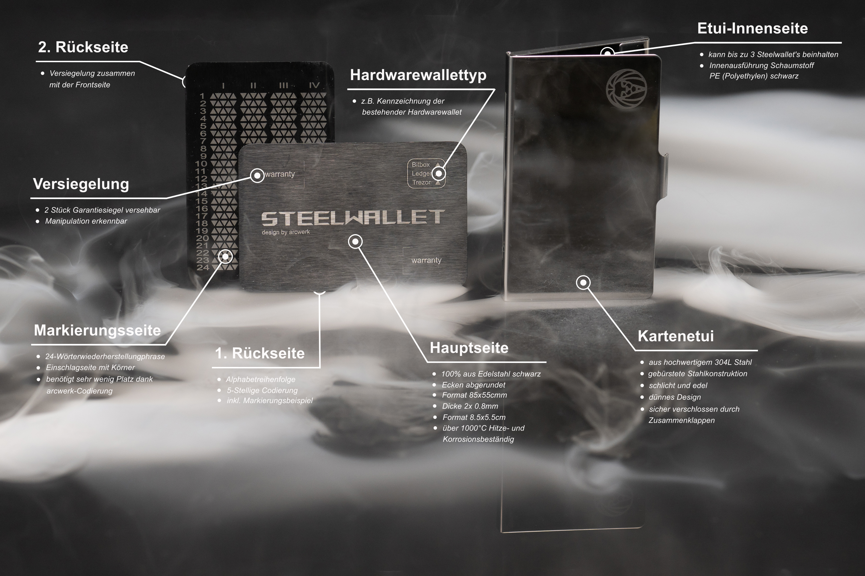 Diese Steelwallet besteht aus langlebigem, rostfreiem Stahl und widersteht extremen Bedingungen wie Feuer, Wasser, mechanischer Gewalt und Korrosion. Es bietet einen physischen Schutz, der über herkömmliche Papier- oder elektronische Backups hinausgeht.